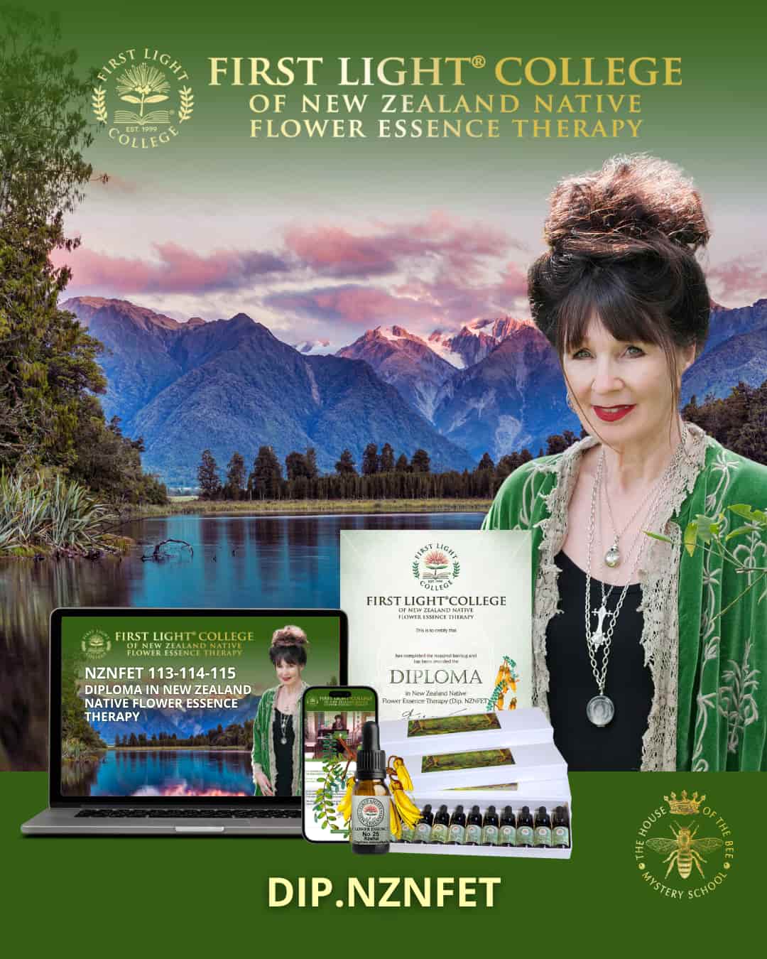 Dip.NZNFE Online Course Bundle: Learn how to support every day holistic wellbeing for yourself and assist others at all levels of the being, including personality, aura, chakras, DNA, soul and spirit with First Light Flower Essences of New Zealand® flower, fern, tree, seeds, plant, healers and shamanic essences No's 1-120. Get access to the five phases of the the House of the Bee® Nature’s Holistic Healing Matrix© as well as the two advanced levels of the the House of the Bee® Advanced Holistic Healing Matrix© to change your life and empower others.